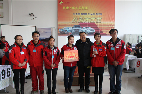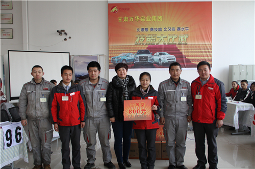 (董事會(huì)辦公室 盛玉卿)掌聲送給汽車公司一線崗位學(xué)習(xí)和戰(zhàn)斗著的同事們!2014年12月26日下午,由甘肅萬(wàn)華汽車監(jiān)事會(huì)、萬(wàn)華人資公司共同主辦的“2014年汽車公司‘技能大比武’”在甘肅萬(wàn)華進(jìn)口三菱展廳成功舉辦。6家汽車公司通過(guò)抽簽選出的36名參賽選手參加了此次比賽。經(jīng)過(guò)兩個(gè)半小時(shí)的激烈角逐,萬(wàn)華金盛隊(duì)以團(tuán)體163分的總成績(jī)大比分奪冠。而隨著現(xiàn)場(chǎng)個(gè)人參賽成績(jī)統(tǒng)計(jì)結(jié)果的揭曉,萬(wàn)華金盛售后服務(wù)經(jīng)理李惠萍榮獲個(gè)人總分第一,使得萬(wàn)華金盛毫無(wú)懸念地成為本屆“技能比武”中的大贏家。