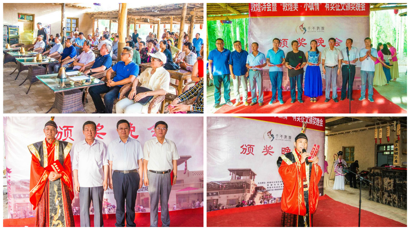 6月9日,端午佳節(jié),敦煌詩(shī)會(huì)暨“敦煌美·小鎮(zhèn)情”頒獎(jiǎng)晚會(huì)在月牙泉小鎮(zhèn)拉開帷幕。中共敦煌市委常委、宣傳部部長(zhǎng)、市政府副市長(zhǎng)王愛國(guó),敦煌市文聯(lián)名譽(yù)主席、書法家協(xié)會(huì)主席邊振國(guó),敦煌市文聯(lián)副主席趙虎,敦煌市文聯(lián)副主席、作家協(xié)會(huì)主席李茂錦,敦煌市文聯(lián)副主席趙福師,敦煌月泉小鎮(zhèn)旅游服務(wù)有限公司總經(jīng)理宿曉中,上海金翅鳥文化旅游發(fā)展有限公司監(jiān)事王文彬,千年敦煌·月牙泉小鎮(zhèn)商戶協(xié)會(huì)會(huì)長(zhǎng)劉軍共同見證了這個(gè)激動(dòng)人心的時(shí)刻。