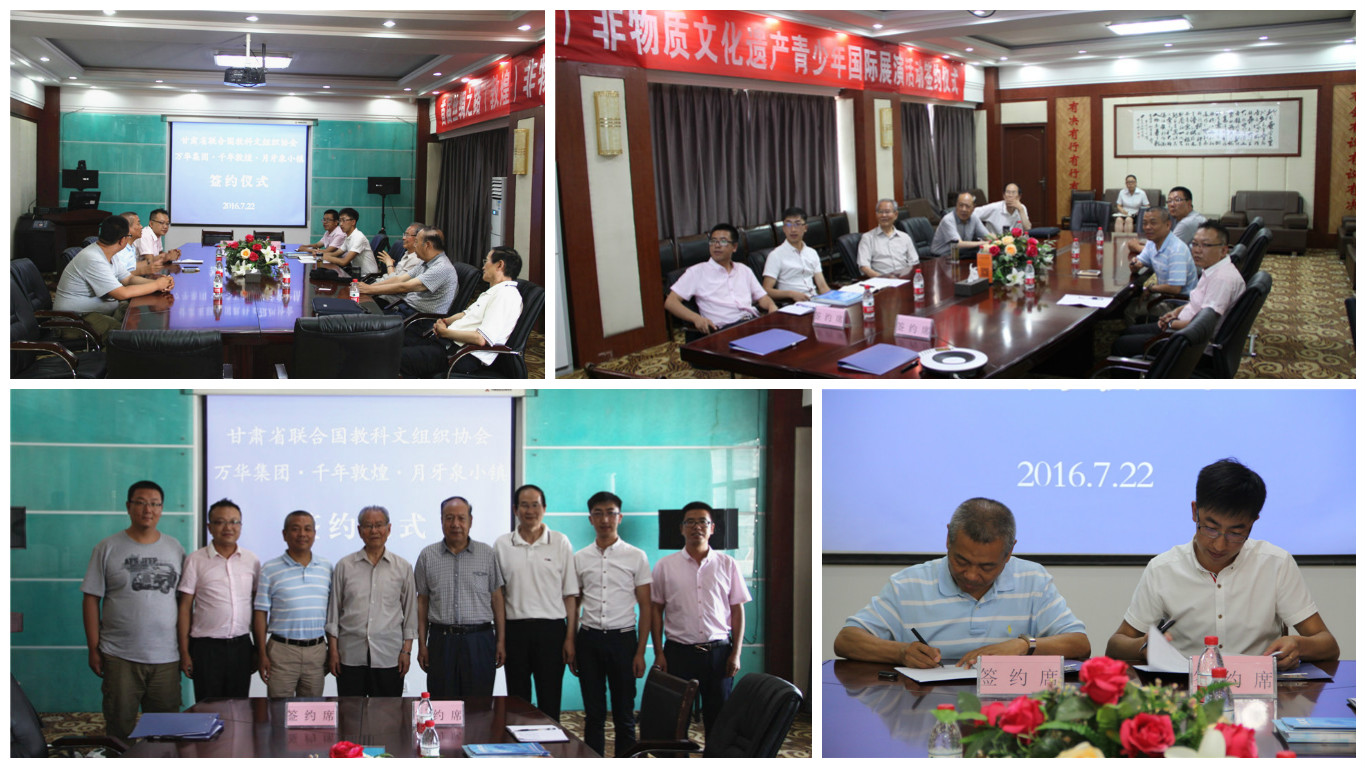 7月22日下午3時30分,甘肅省聯(lián)合國教科文組織協(xié)會杜永軍會長與甘肅萬華實業(yè)集團(tuán)總經(jīng)理、敦煌千年古城開發(fā)有限公司董事長牛新偉,在萬華集團(tuán)三樓會議室就“首屆絲綢之路(敦煌)非物質(zhì)文化遺產(chǎn)青少年國際展演活動”合作事宜正式簽約。甘肅省人民政府原副秘書長、協(xié)會總顧問于忠正,甘肅省教育廳原副廳長、協(xié)會終身榮譽會長馬培芳等領(lǐng)導(dǎo)出席并見證了簽約儀式。