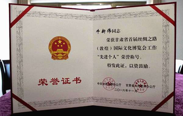 近日,首屆絲綢之路(敦煌)國際文化博覽會總結表彰大會在敦煌大劇院召開。會議表彰了首屆文博會工作中敦煌市涌現出來的50個先進集體、160名先進個人,以及1300多名群防群治工作先進個人。敦煌千年古城開發(fā)有限公司董事長牛新偉榮獲“先進個人”榮譽稱號。