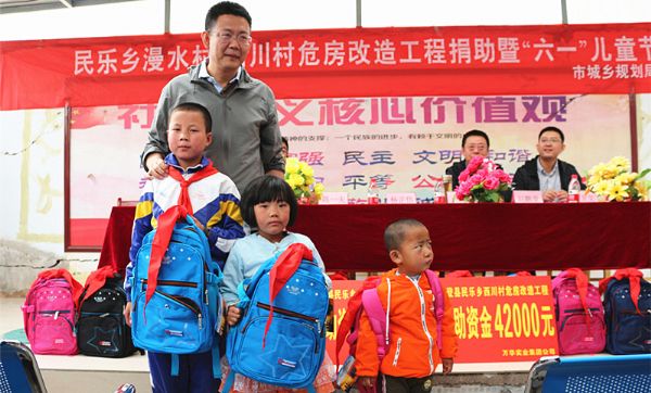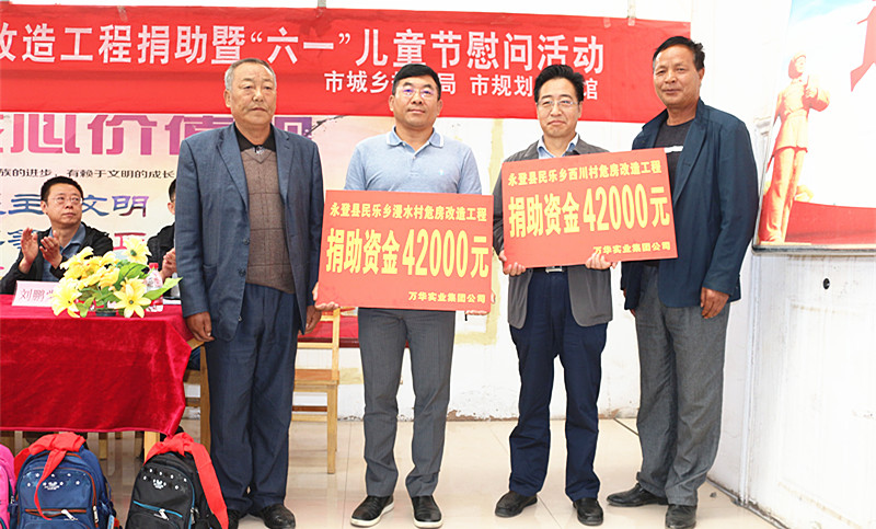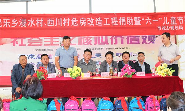 6月1日上午11時20分,民樂鄉(xiāng)漫水村、西川村危房改造工程捐助暨六一兒童節(jié)活動在永登縣民樂鄉(xiāng)漫水村村委會如期舉行。甘肅萬華實業(yè)集團有限公司向漫水村、西川村各捐助4.2萬元危房改造補助資金,蘭州市城鄉(xiāng)規(guī)劃局領(lǐng)導將嶄新的書包和學生用品送到當?shù)睾⒆觽兪种。蘭州市城鄉(xiāng)規(guī)劃局局長陳一夫、黨組書記楊正岱,蘭州市城鄉(xiāng)規(guī)劃局黨組成員、副局長盧健、楊正華、劉鵬堂,甘肅萬華實業(yè)集團有限公司董事長牛新民、副總經(jīng)理宿曉中,民樂鄉(xiāng)漫水村黨支部書記張成海,民樂鄉(xiāng)西川村黨支部書記楊天海等領(lǐng)導出席活動。