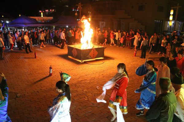 當天晚上,月牙泉小鎮(zhèn)舉辦了篝火晚會。舞臺上輪番的精彩表演,讓游客們體驗了民俗的真情。入夜時分,盡管天空下著毛毛細雨,但是絲毫不阻礙人們的歡快之情。篝火熊熊,火光沖天,歡樂的人們手挽著手,一邊伴隨著音樂韻律盡情舞動,一邊拍手擊節(jié)低唱淺吟,沉浸在無比歡樂之中。