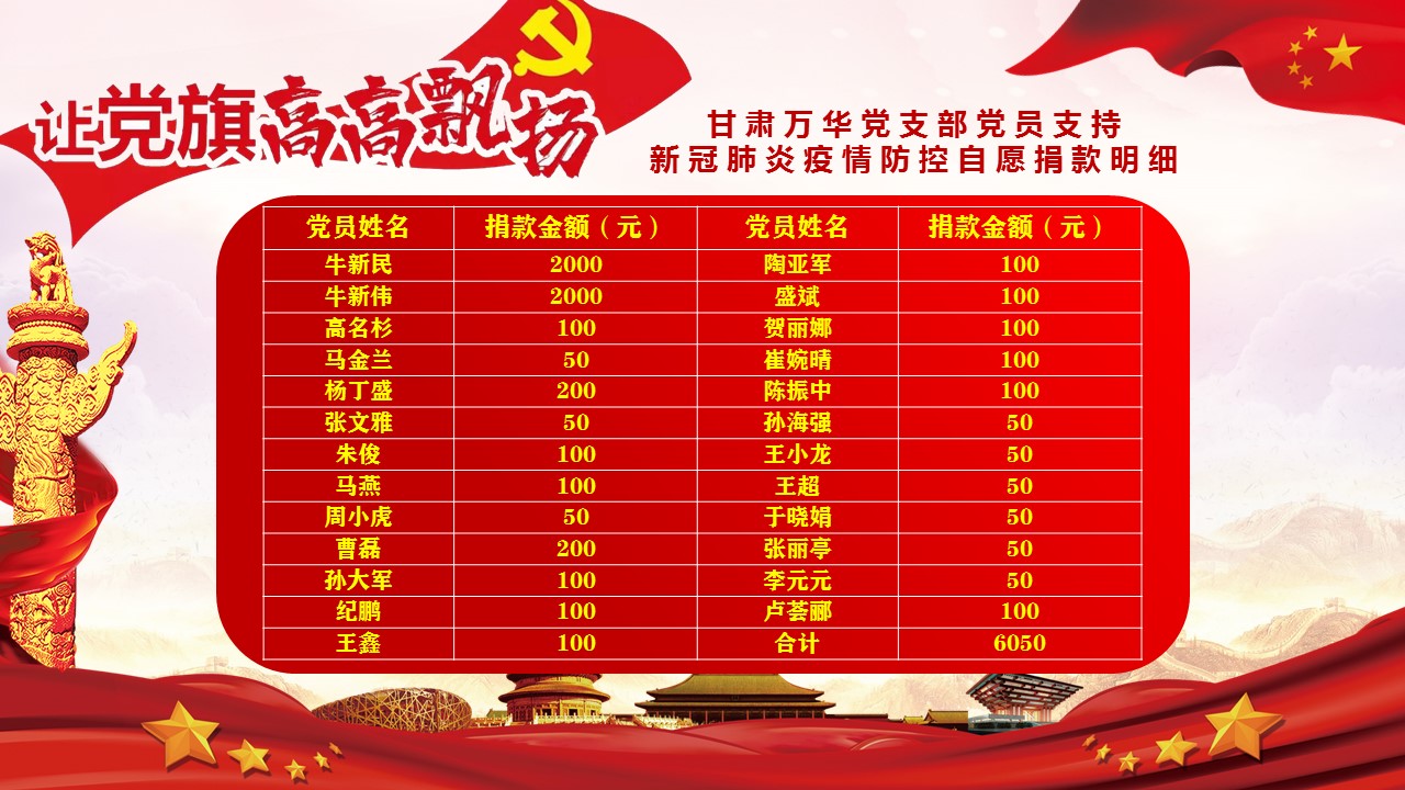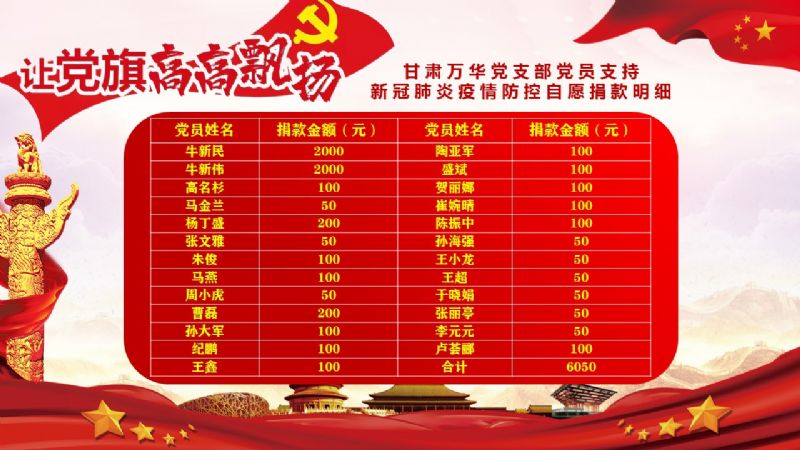 截止到當(dāng)日17時,共有25名萬華集團(tuán)黨支部黨員、預(yù)備黨員、入黨積極分子自發(fā)地進(jìn)行了捐款,捐款總額6050元。這筆捐款通過蘭州市總商會黨委統(tǒng)一捐至防疫工作最需要的第一線,主要用于慰問戰(zhàn)斗在疫情防控斗爭第一線的醫(yī)務(wù)人員、基層干部群眾、公安民警和社區(qū)工作者等,資助因患新冠肺炎而遇到生活困難的群眾和因患新冠肺炎去世的群眾家屬,慰問在疫情防控斗爭中犧牲的干部群眾家屬等。